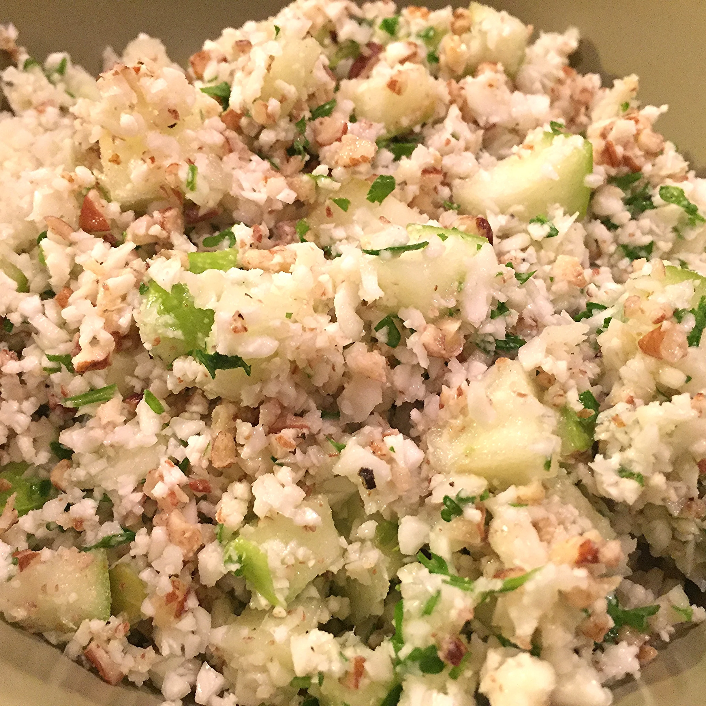 Use a food processor (I used a Ninja) to chop up the cauliflower and parsley, and put them in a bowl. Cut up the 2 lemons (use more if you want it tarter), and squeeze the juice over the cauliflower parsley mix. Let it marinade for about 20 minutes. In the meantime, cut up the green apple into tiny cubes and chop up the pecans. Mix the remaining ingredients with the cauliflower and parsley. Season with salt and pepper. Put in the refrigerator to chill before serving.