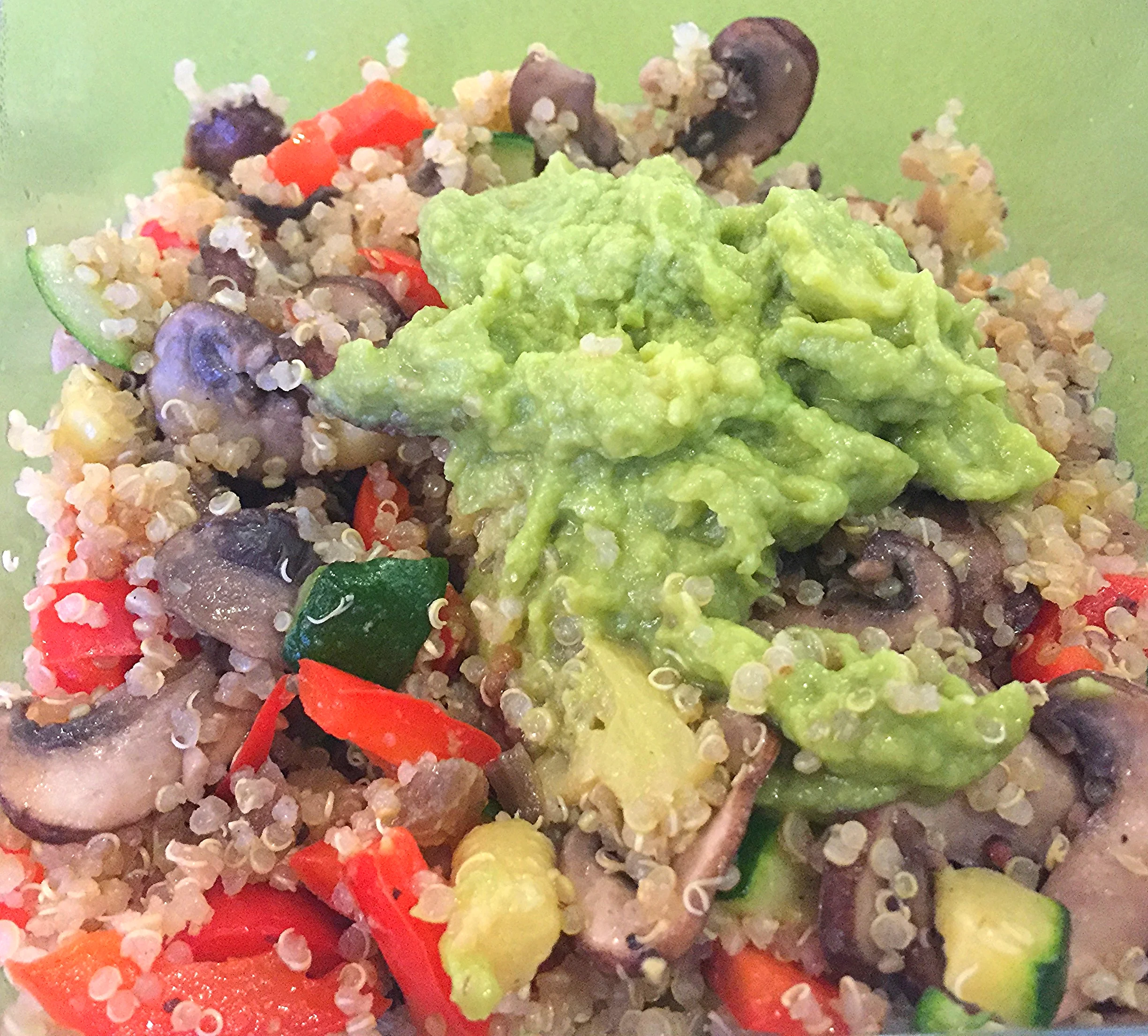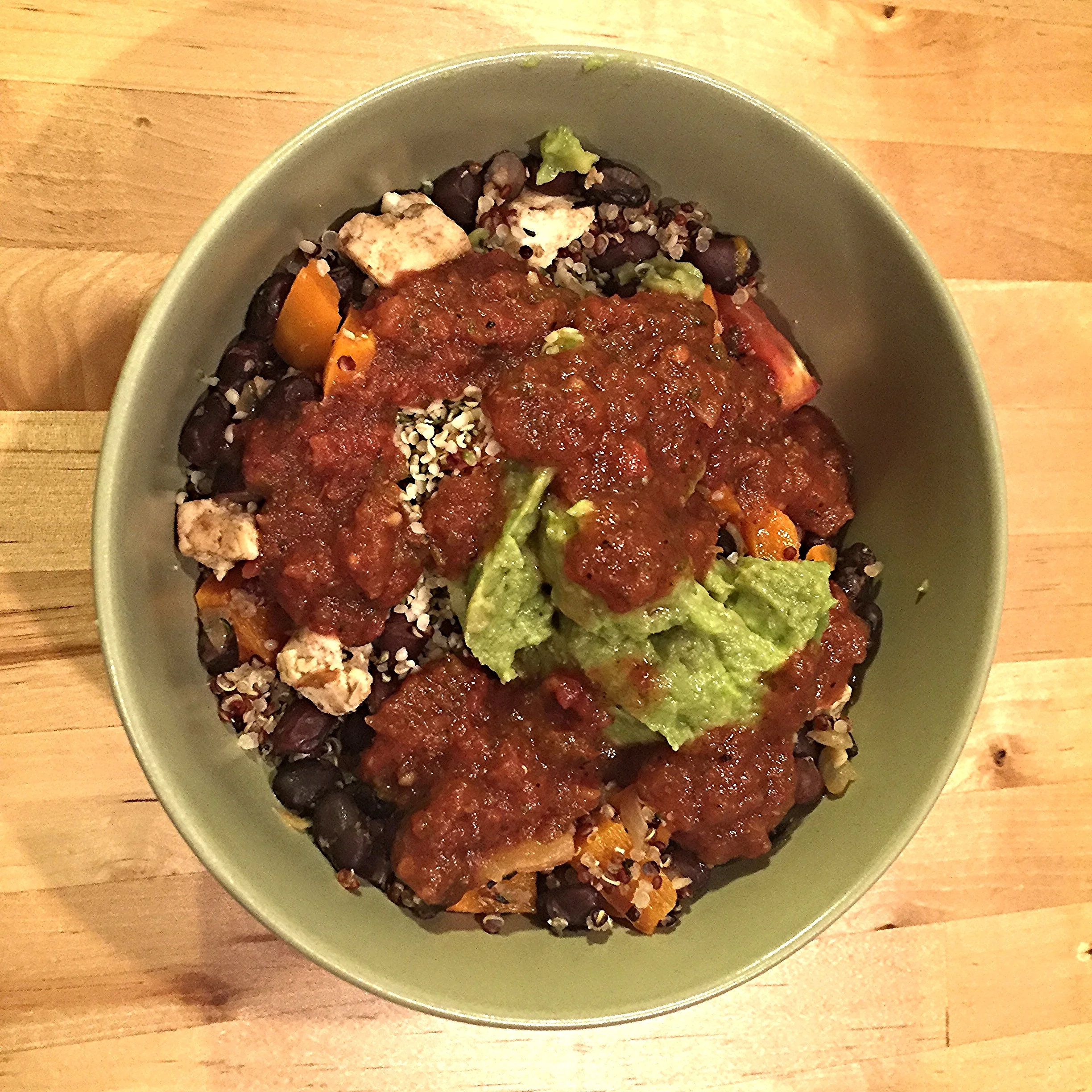 I used precut fajita veggies, black beans, crimini mushrooms, baby spinach and garlic. I fried the garlic and onions first, then the mushrooms, fajita veggie mix and baby spinach next. I layered it on a bed of quinoa and topped it with double-roasted salsa and guacamole.