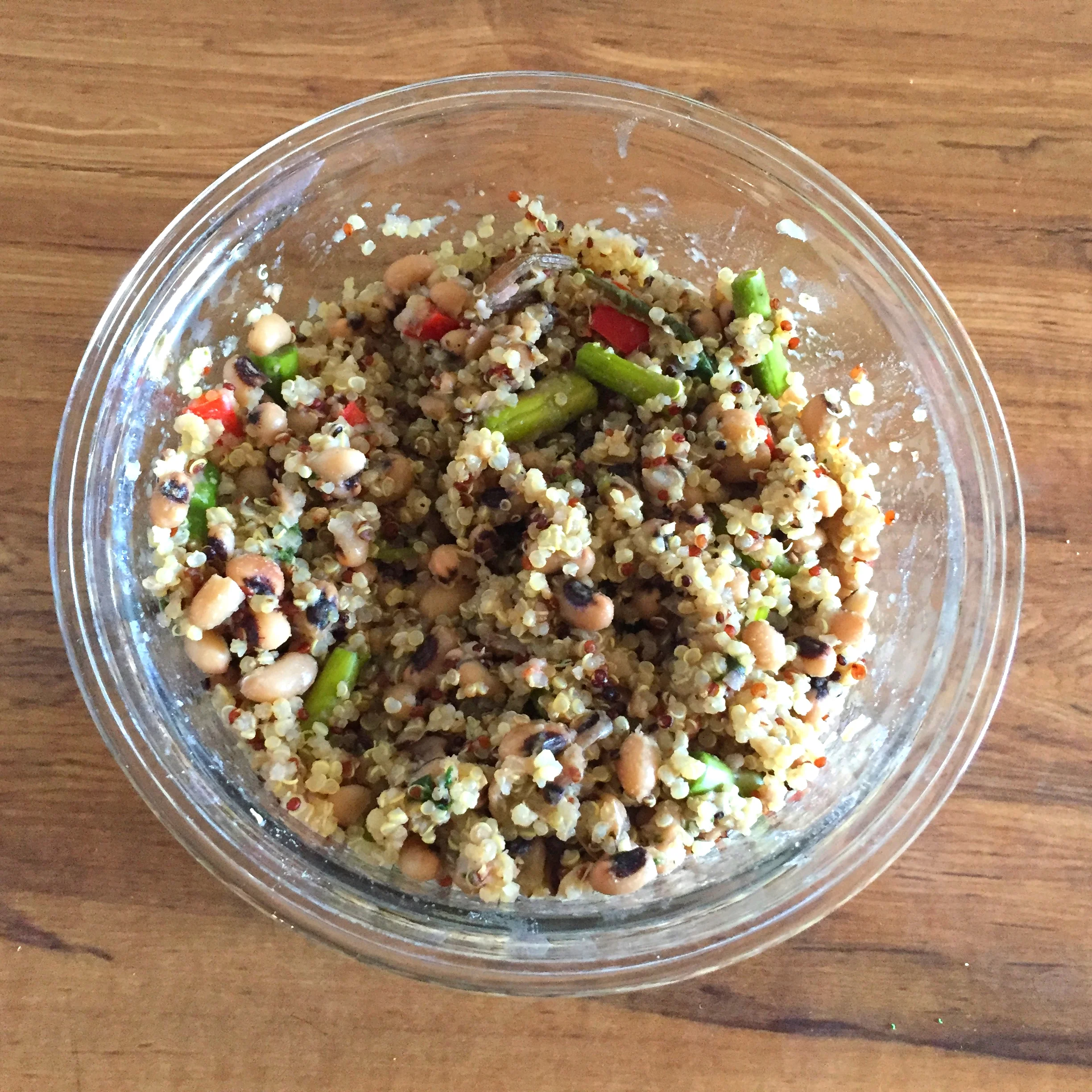 Once the quinoa is cooked and cooled, mix everything in a bowl. Start with 2 tbsp of rice vinegar and add more based on your preference. Season with salt and pepper to taste.