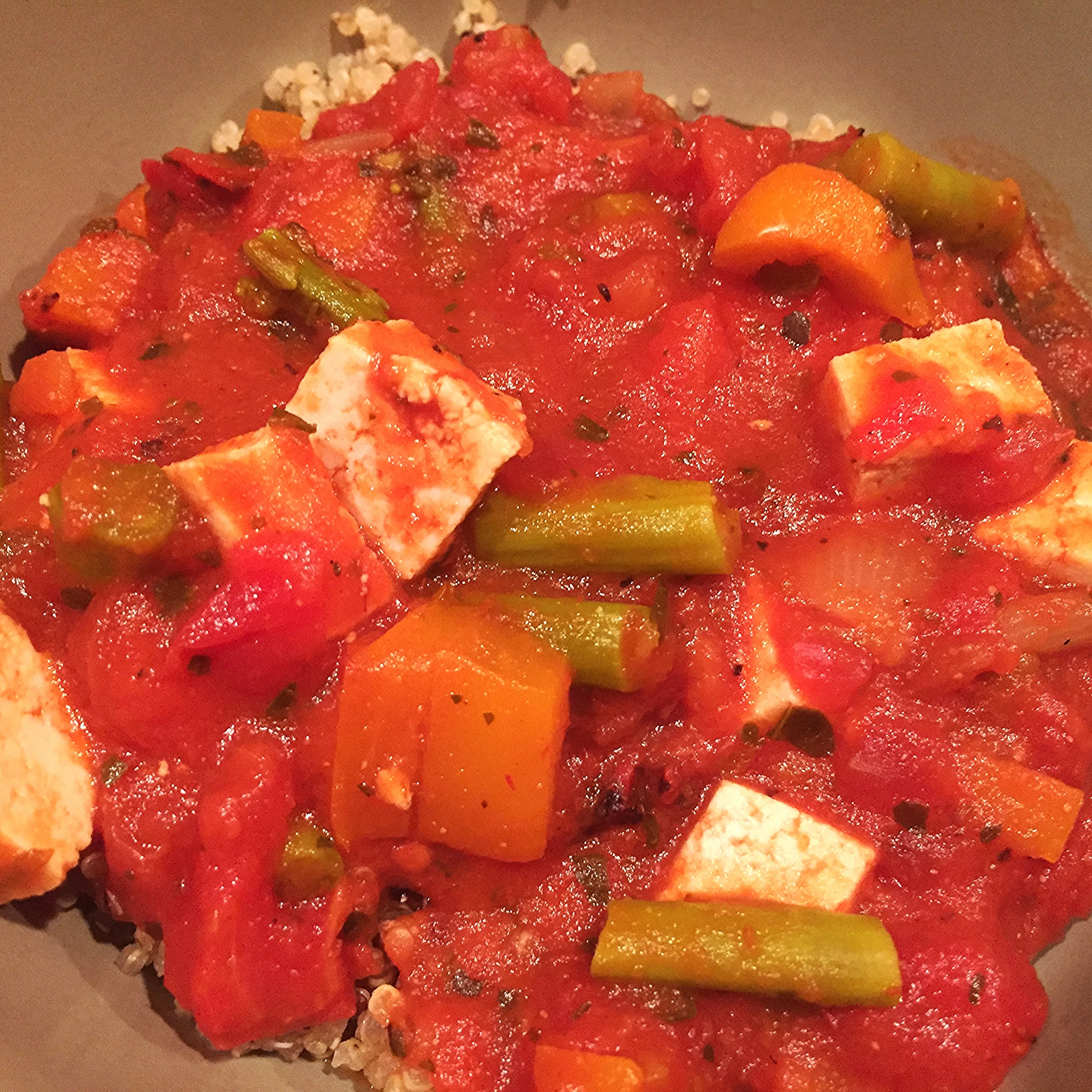 Tofu asparagus marinara with quinoa