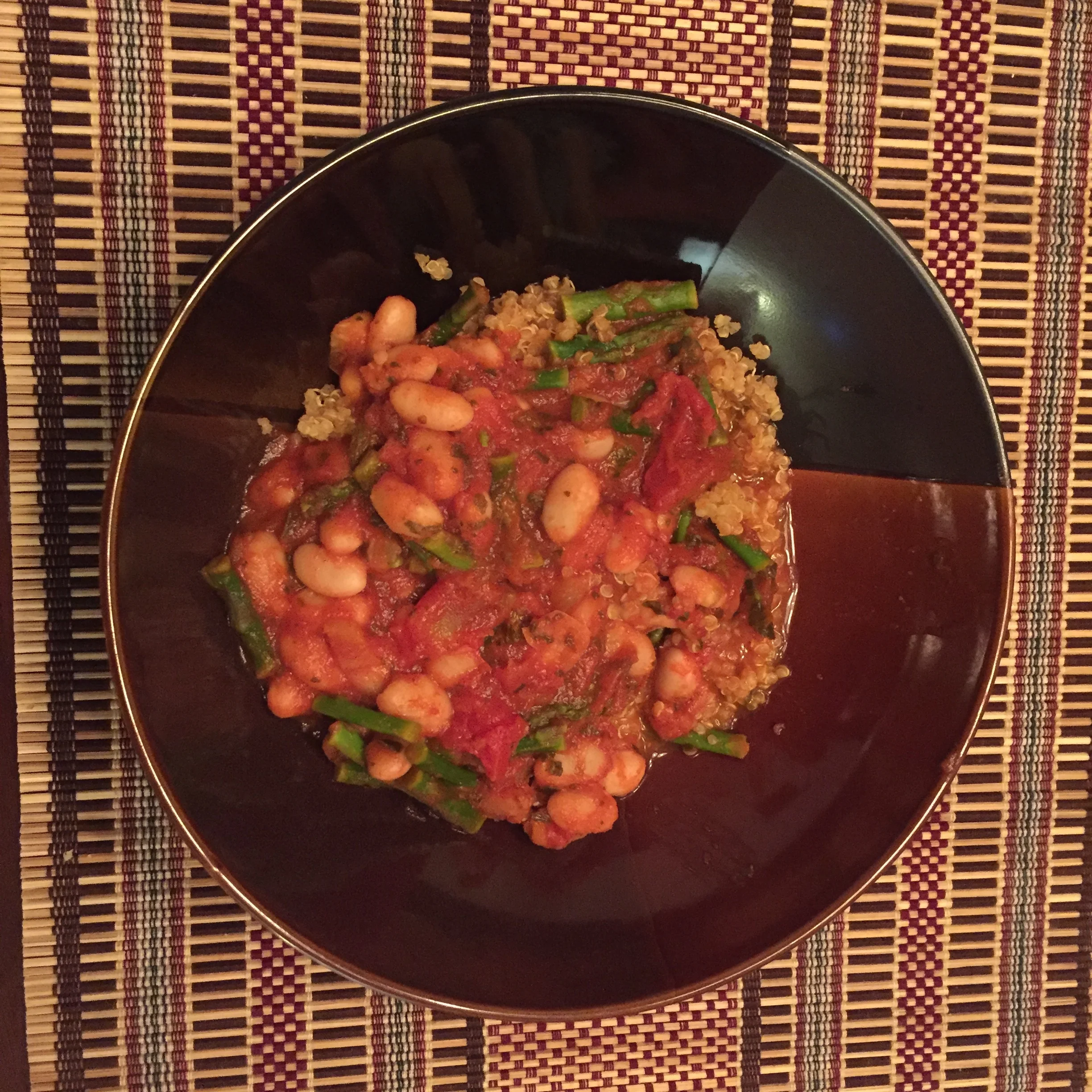 Pour the marinara into a pot and simmer on low heat. Put the chopped asparagus in next, then add seasonings to taste. Add the white kidney beans last, just long enough to heat them up. Once the asparagus has softened, remove from heat and serve over quinoa.